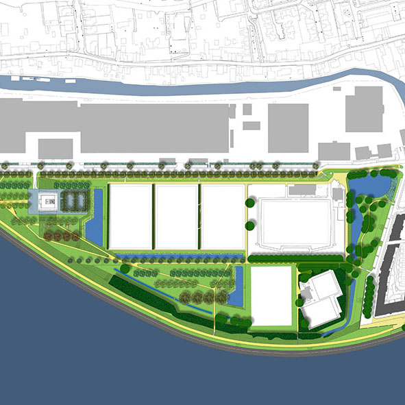 Programma: Parkachtige inrichting drierivierenpunt, landschappelijke inpassing nieuwe hoofdkantoor Fokker en sportvelden, parkeren