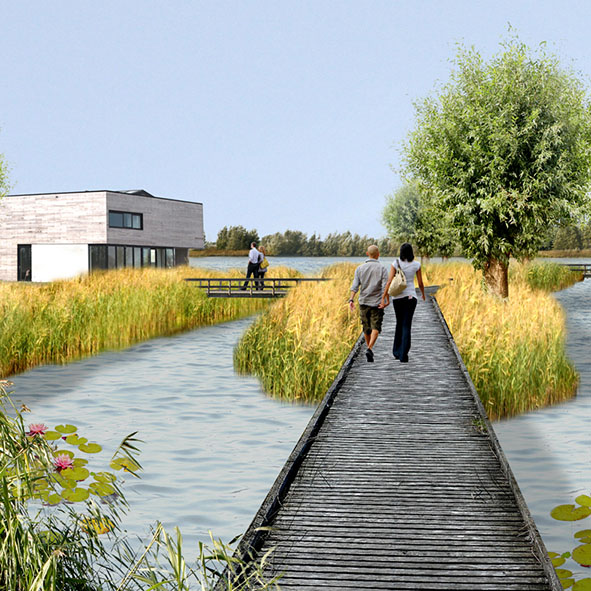 Veld 17b ligt als een langgerekte “strip” tussen een zandwinningsplas en de Minervasingel. Door de plas, als het ware, verder uit te graven tot aan de Minervasingel ontstaan er eilanden. De extra watergangen en rietoevers sluiten aan op de ontwikkeling van een natte ecozone ten noorden van Veld17b. Door de rietoevers zijn de eilanden geschikt voor de ontwikkeling van individuele woningen op vrije kavels. Tussen de eilanden door loopt een openbare wandelroute met zicht op de stuwwal van de Veluwe.