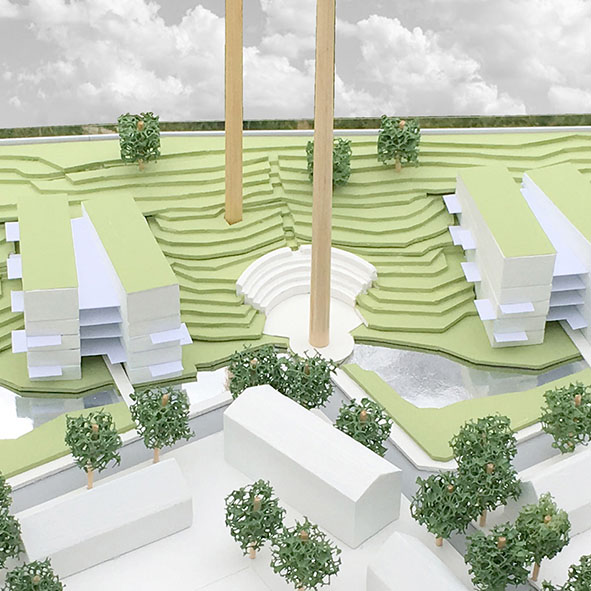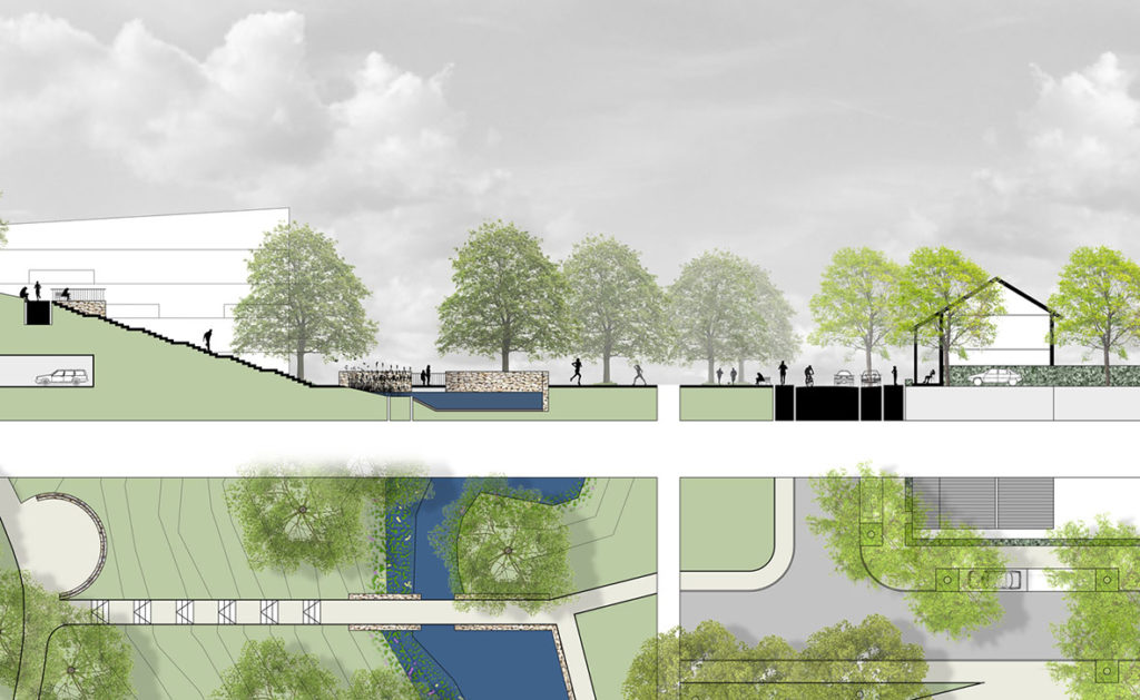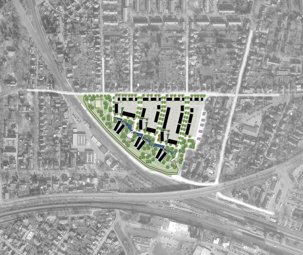 Herontwikkeling voormalig industrieterrein in binnenstedelijk gebied. Strategisch omgaan met het 16 meter hoge geluidsscherm langs het spoor aan de zuidzijde en het aansluiten op de omliggende woonwijken zijn de belangrijkste uitgangspunten voor deze prijsvraag. Door het creëren van een nieuw heuvellandschap met daarop 3 appartementengebouwen en daarin opgenomen parkeervoorzieningen ontstaat er een nieuw parkachtig woonmilieu. Een ecologische plas-draszone (hemelwateropvang) aan de voet van het nieuwe heuvellandschap vormt de overgang naar de grondgebonden woningen en is tevens een parkachtige route voor de aangrenzende wijken naar het station.
